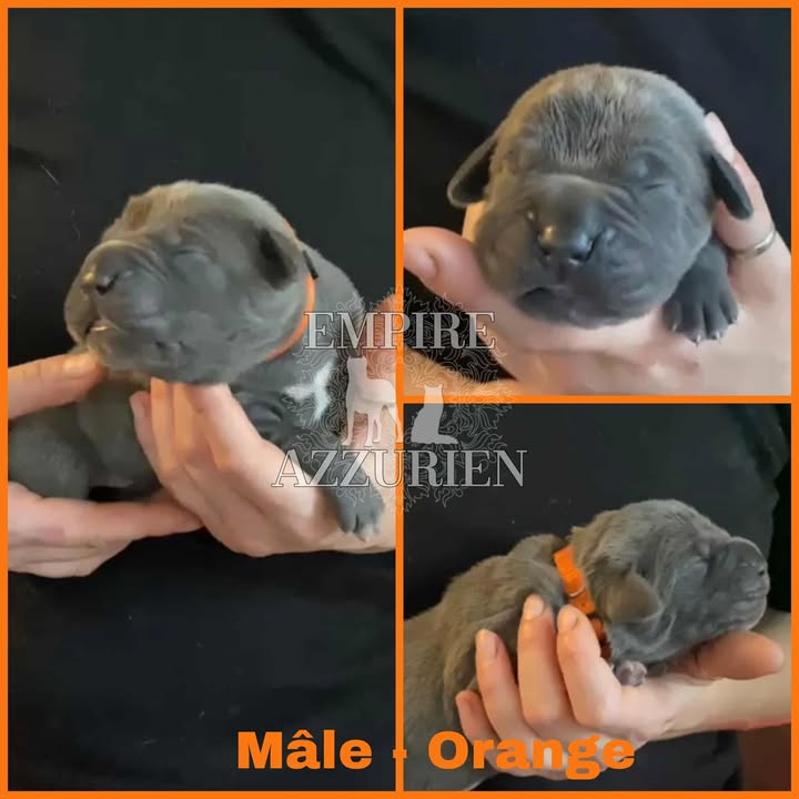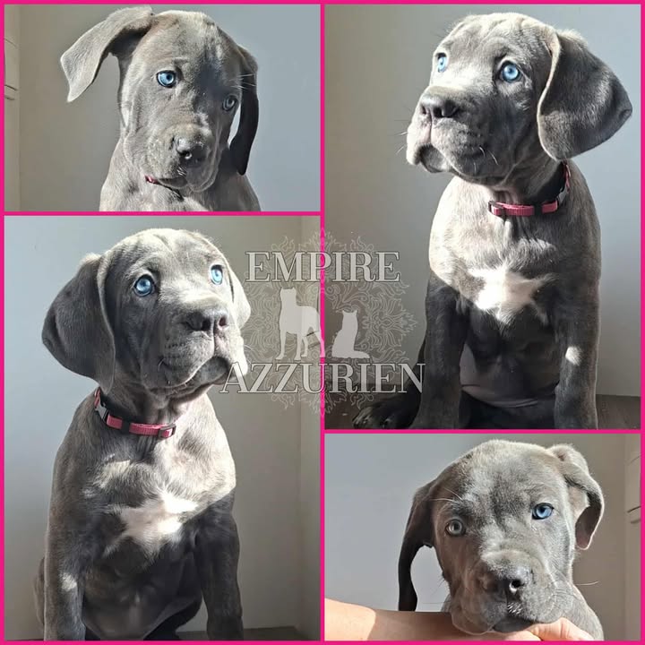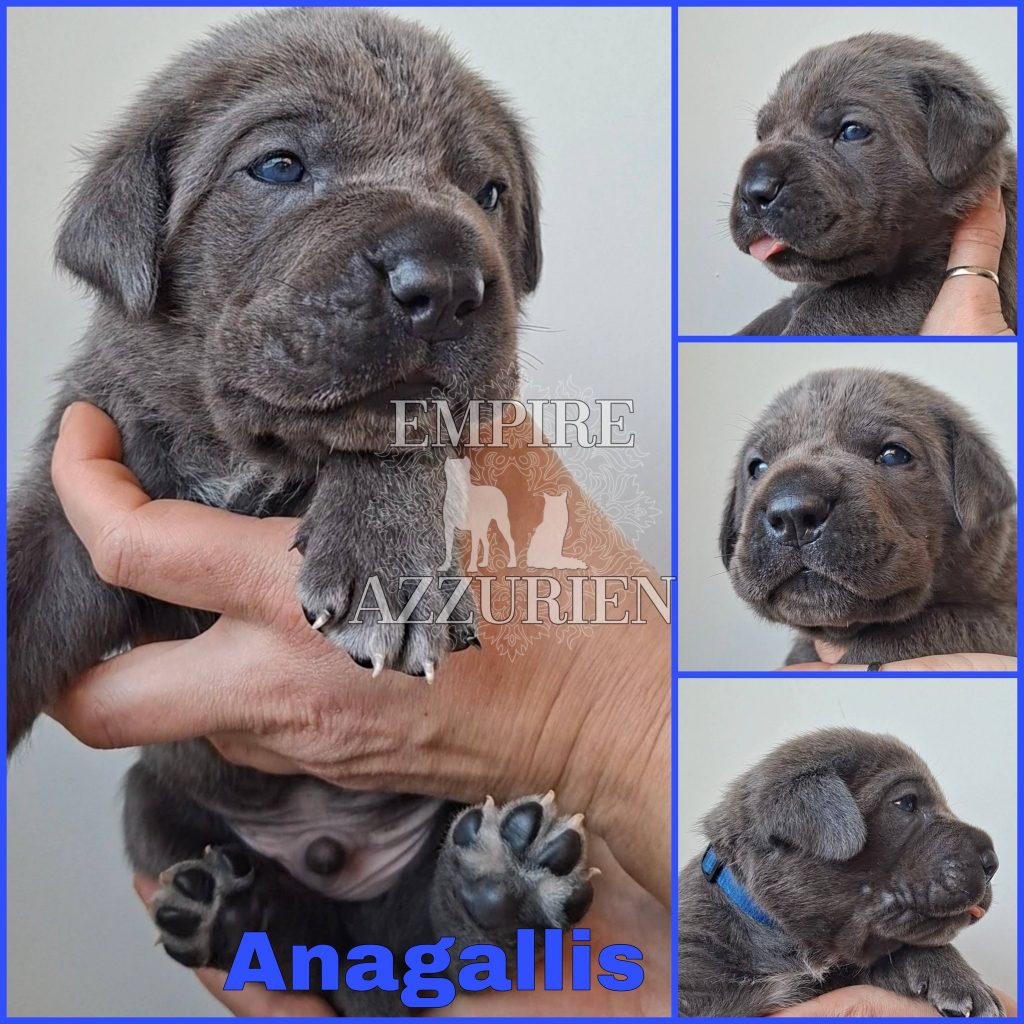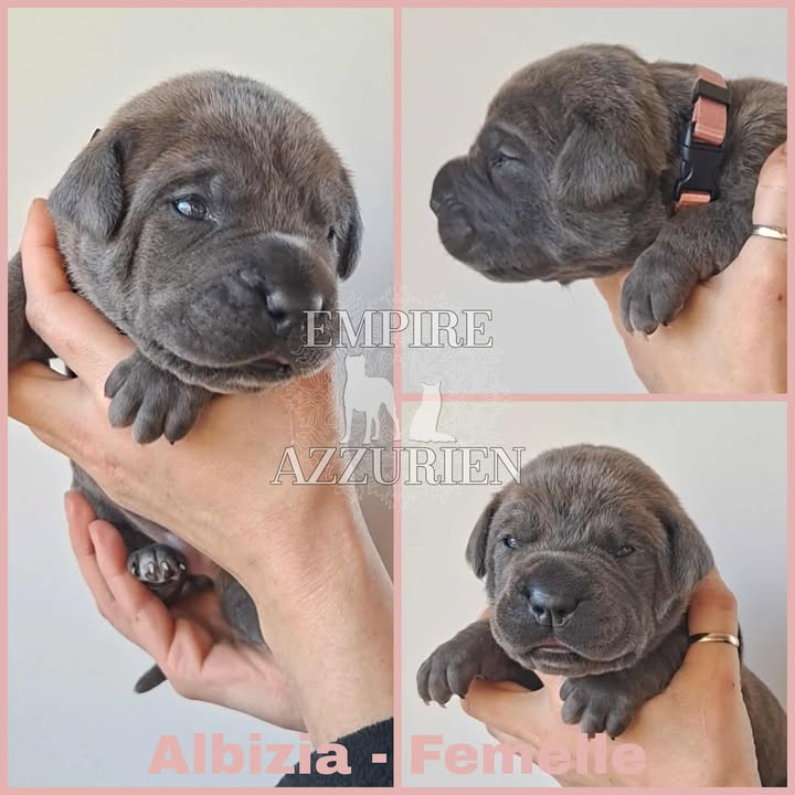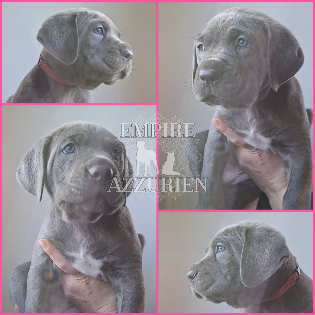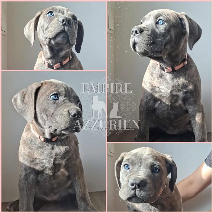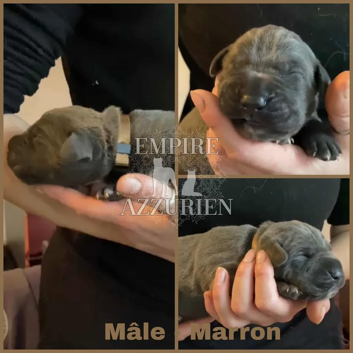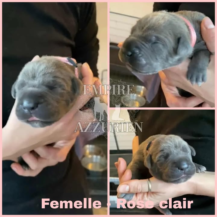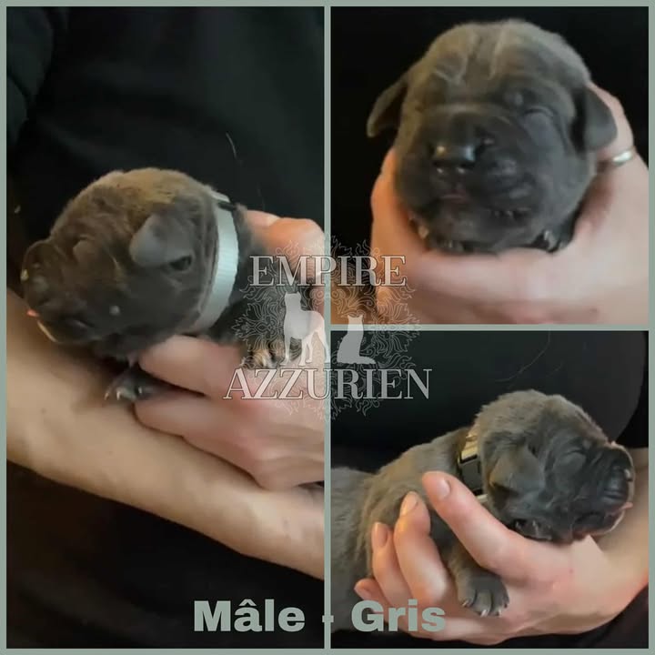 Femelle grise (/bleue). Testée officiellement pour la dysplasie hanches et coudes (HD-B / ED-0). Identifiée par ADN. Négative à la DSRA : N/N.