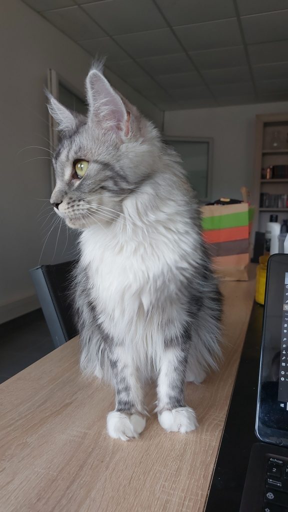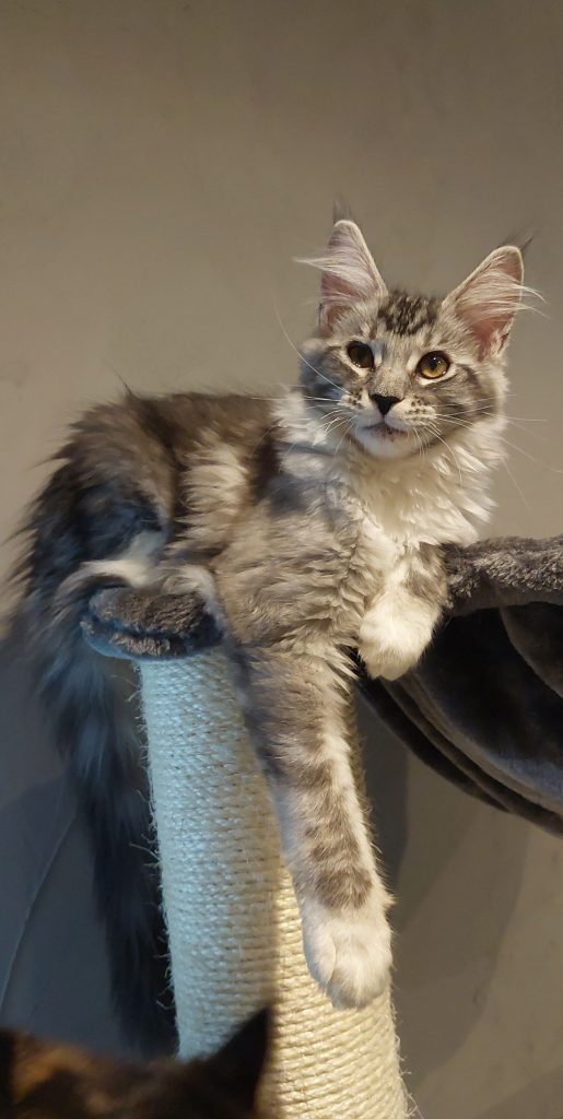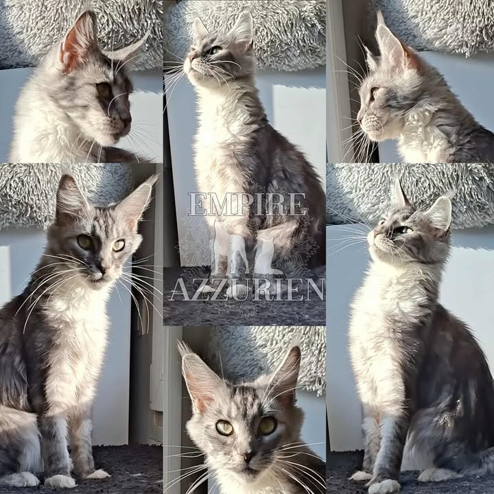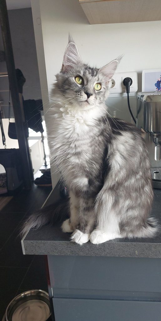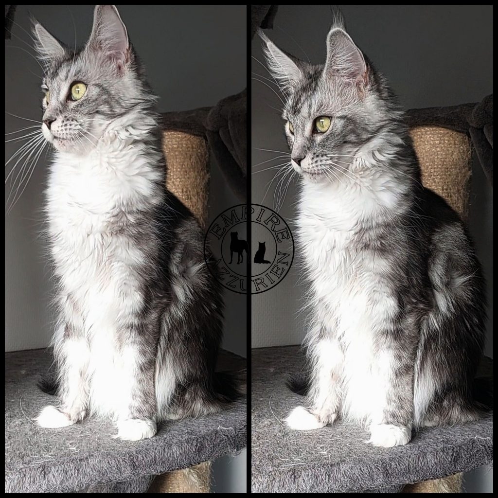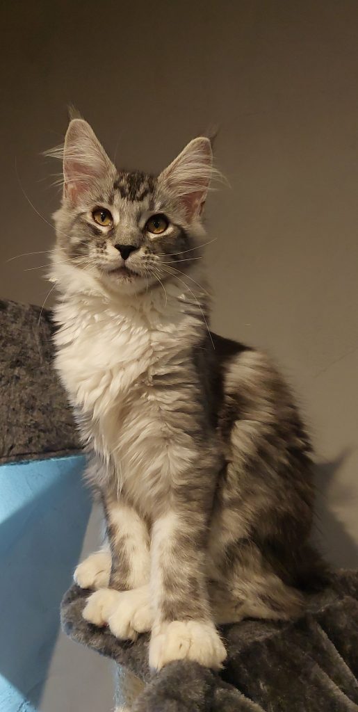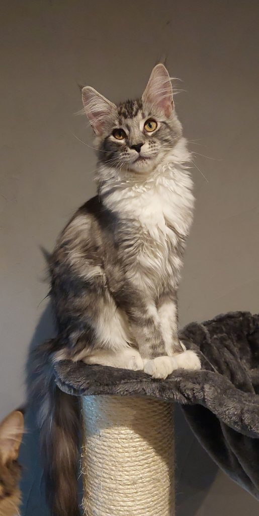 Elle est black silver blotched tabby & white et ses yeux varient du or au vert clair.