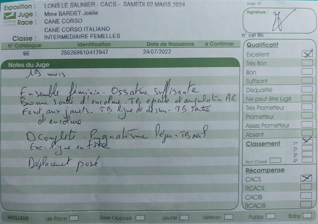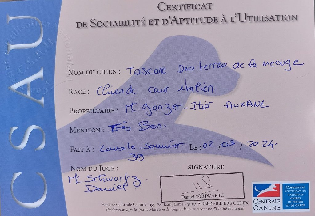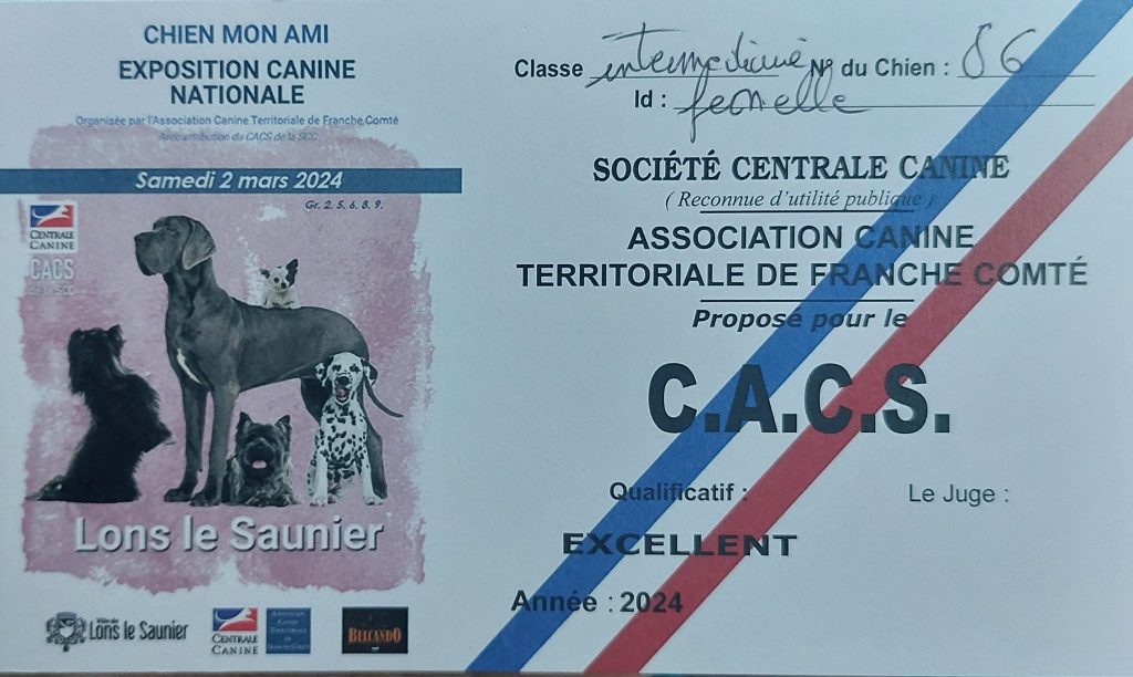 Elle a été présentée pour la première fois en exposition à Lons le Saunier le 02 mars 2024, et à l’issue de cette journée, elle a obtenu son CSAU avec mention très bon.