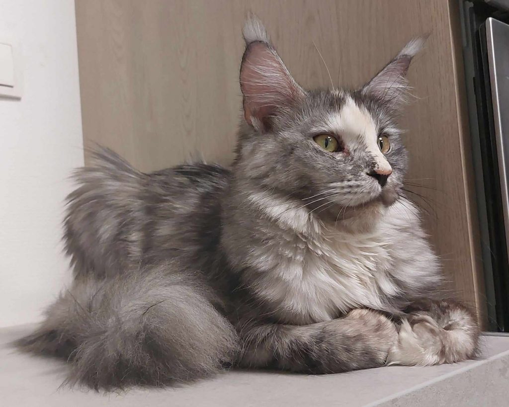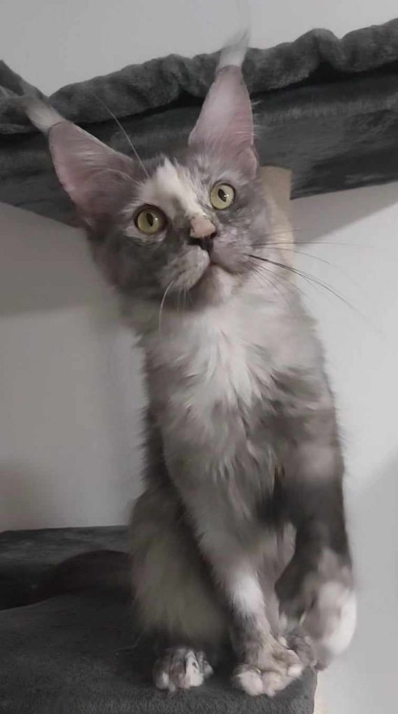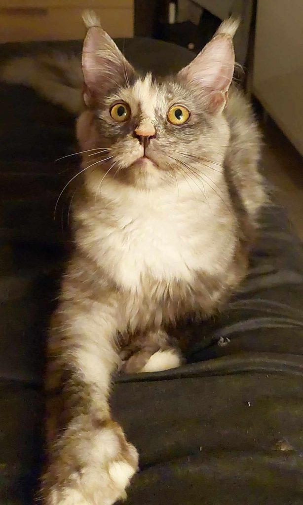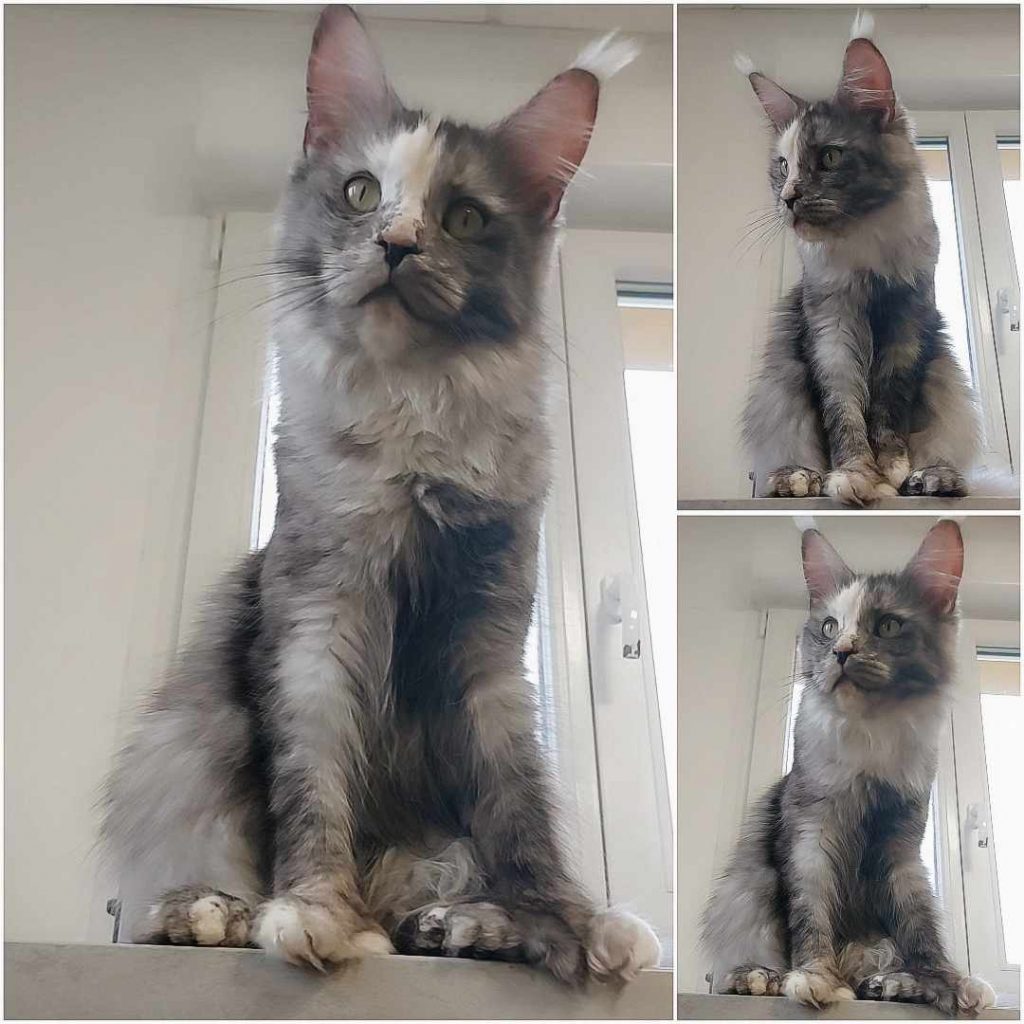 Toundra est une très grande minette, haute sur pattes et toute en longueur. Son poids de forme à l’âge adulte est de 6kg.