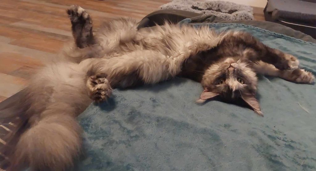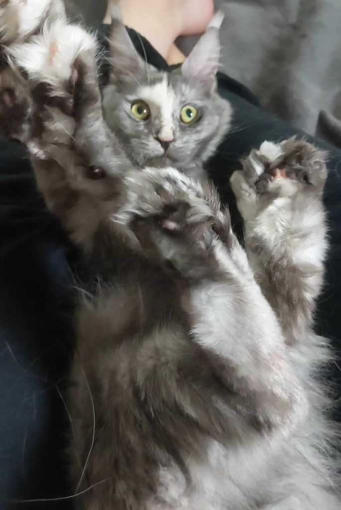 Toundra est une femelle polydactyle (6666) avec des « moufles » aux pattes avant, et des « hamburgers » aux pattes arrières.